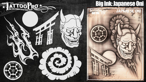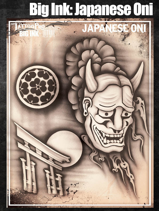 Big Ink: Japanese Oni design sheet features 1 lg Oni stencil, 1 Lg Japanese Fire stencil, 1 Lg Swirl Cloud, 1 Entry, 1 Sun/Moon, 1 Samurai crest that can be used to make realistic airbrush tattoos.