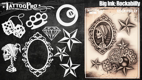 Big Ink: Rockabilly design sheet features All 1 Fuzzy Dice, 1 Brass Knuckles, 1 8-ball, 3 sizes nautical star, 1 Diamond, 1 Lg Skull Girl Cameo that can be used to make realistic airbrush tattoos.