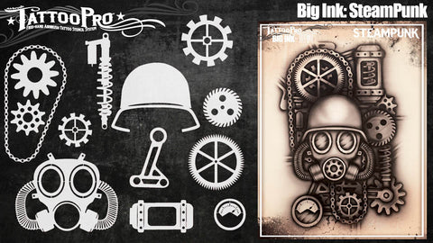 Big Ink: Steampunk design sheet features 1 highly detailed Gas Mask stencil, 6 large Gears, 1 Shock absorber, 1 gauge stencil and other elements that can be used to make realistic airbrush tattoos.